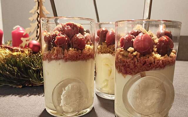 Tipp: Die Creme hält sich im Kühlschrank sehr gut. Spekulatiusbrösel, Kirschen und Topping erst kurz vor dem Servieren hinzufügen, damit alles schön crunchy bleibt.