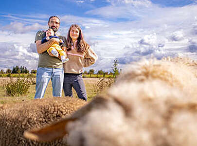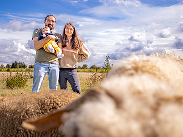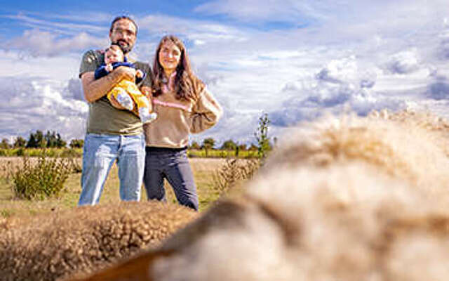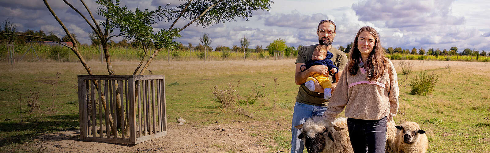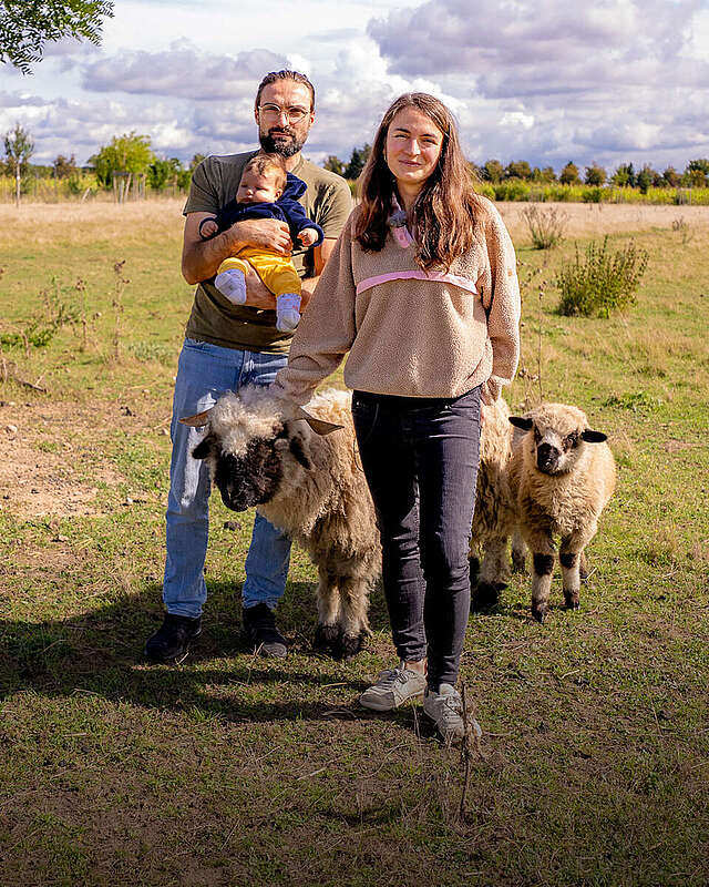 Die Spätsommer-Morgensonne erwärmt langsam den nachtkalten Asphalt der Flaeming-Skate im Landkreis Teltow-Fläming und wenige Meter weiter auch das Weidegras in Reinsdorf. Drei langbeinige Schatten fallen wolkenähnlich auf den Boden. „Määäh“, ruft Schwarznasenschaf Wanda und holt sich die erste Streicheleinheit des Tages von Luisa und Lee-Roy Lutter, während Baby Lucy friedlich in der Trage schläft. Noch vor vier Jahren hätte niemand gedacht, dass ein Wochenende für die Berliner Familie einmal so beginnen würde.