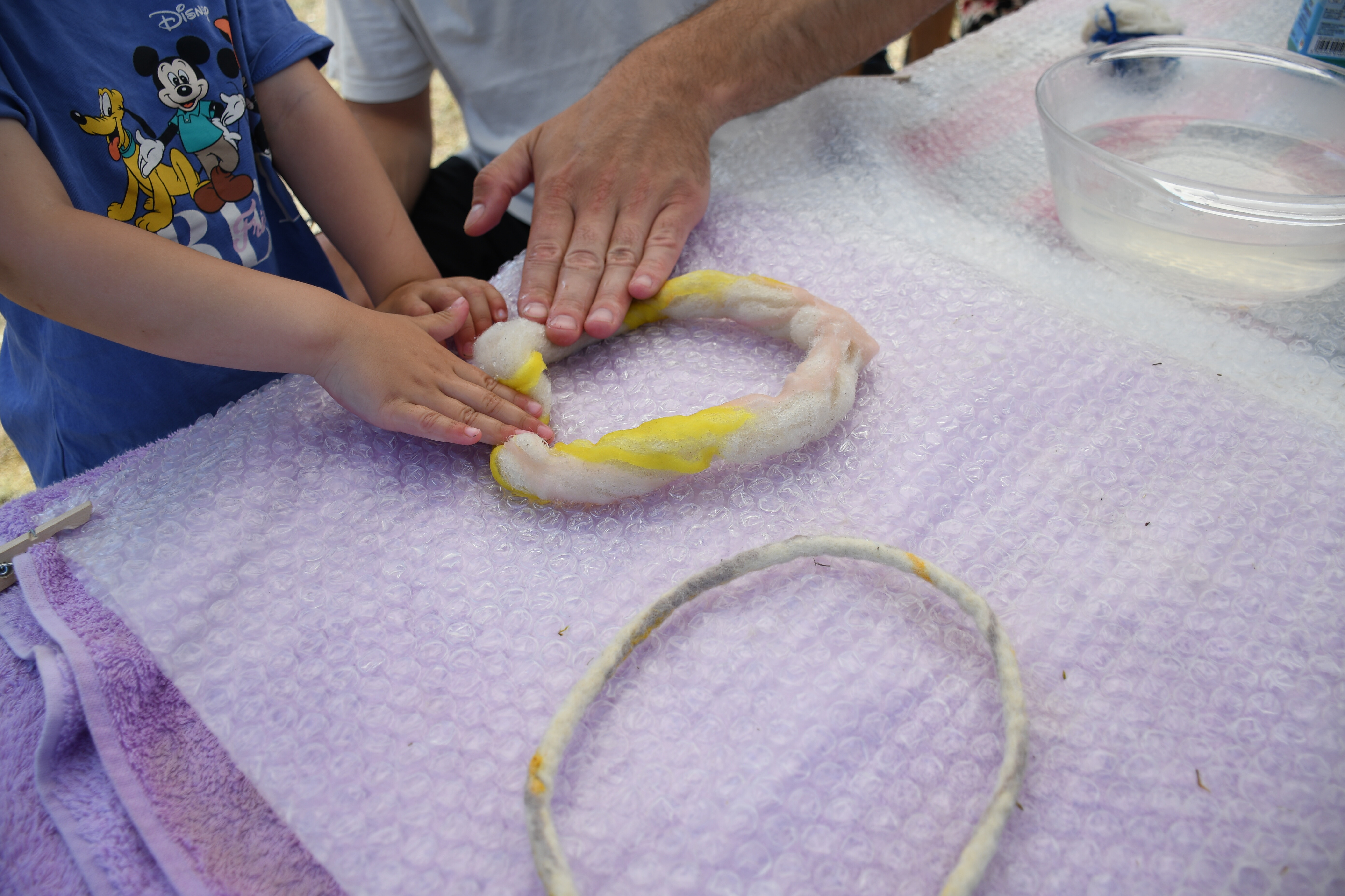 Die einzelnen Verarbeitungsschritte der Wolle werden erklärt und es darf selbst gefilzt werden.