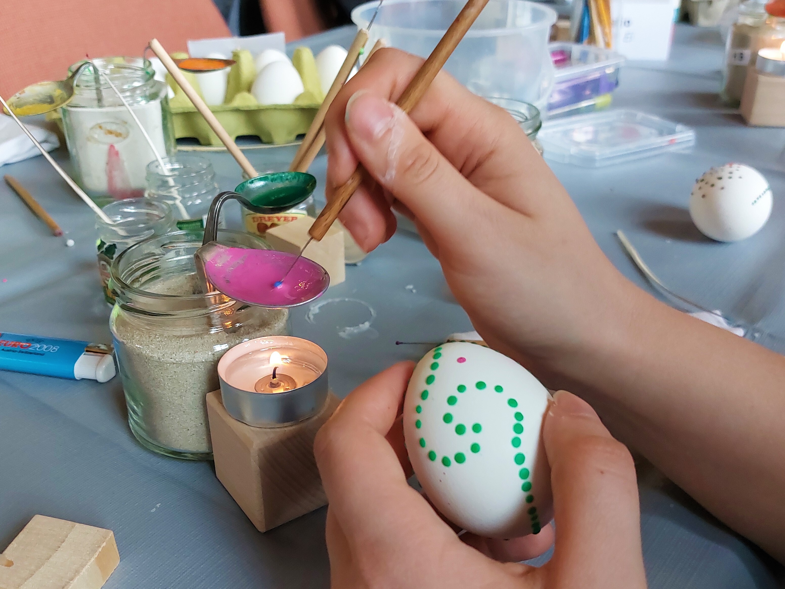 Mit verschiedenen Bastelständen und Mitmachstationen sowie Livemusik am Akkordeon laden wir alle in den Wappensaal ein. Sorbische Ostereier können mittels der Wachsbossiertechnik selbst gestaltet werden. Wer Lust hat, kann Osterdeko filzen oder die Schreibkunst der Kalligraphie ausprobieren. Leckere Häppchen, Kaffee und selbstgebackener Kuchen sorgen für das leibliche Wohl. Ein kleiner Ostermarkt mit Keramik, Deko, Schmuck und Honigprodukten rundet das Programm ab.